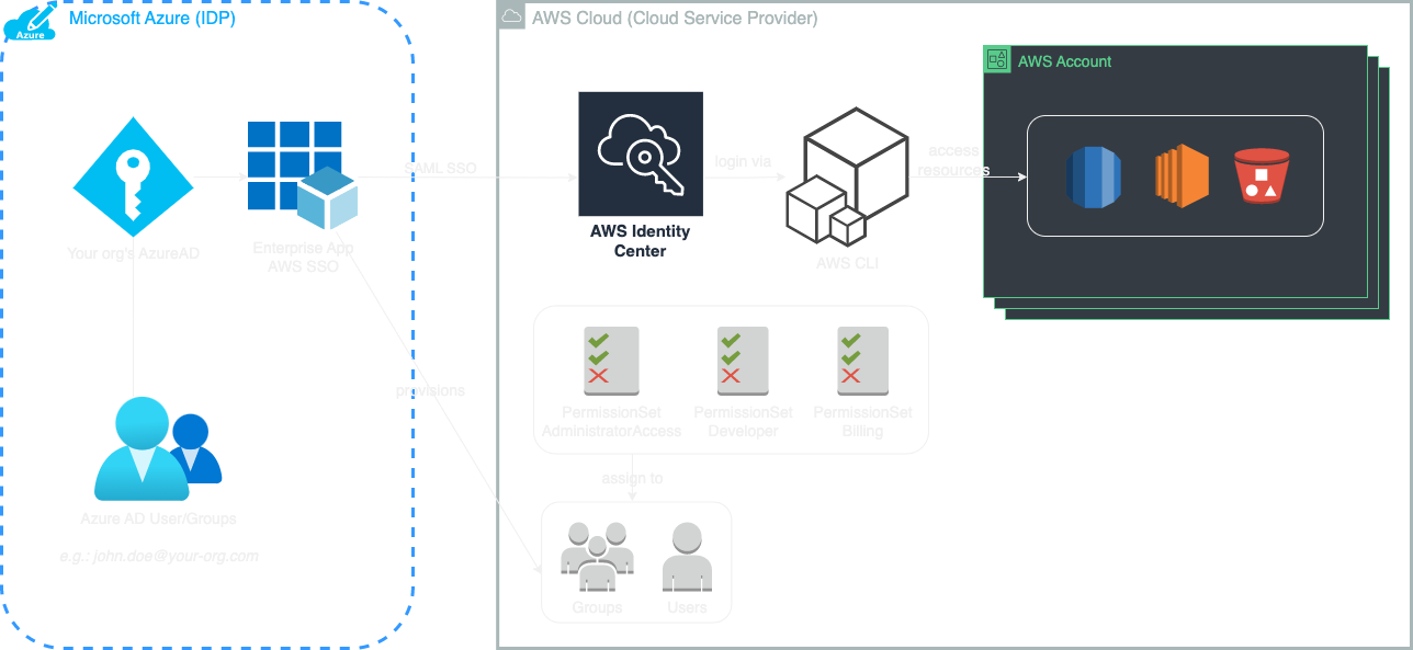 In Azure, the ‘Enterprise Application AWS SSO’ sets up a trust relationship between Azure and AWS using SAML. After establishing this relationship, any Azure user or group added to “AWS SSO” are then provisioned in the AWS Identity Center. These provisioned users and groups can be allocated to various AWS accounts associated with the AWS Organization. Within each account, users or groups are assigned one or more PermissionSet(s) in AWS. These PermissionSets correspond to IAM roles in each account, which in turn define a set of IAM policies. In short a PermissionSet is similar to the classic IAM Role; except that it can be applied across multiple AWS accounts.